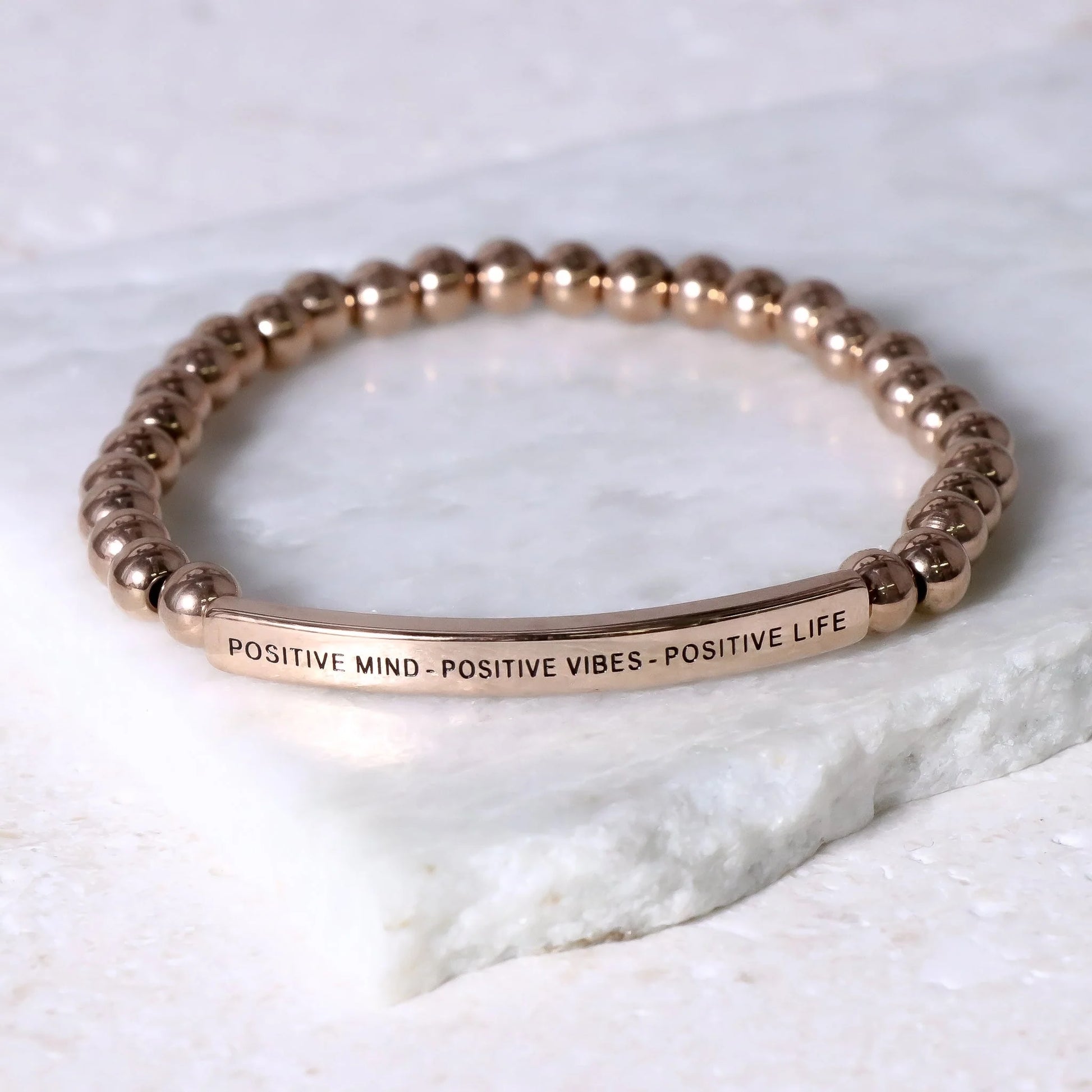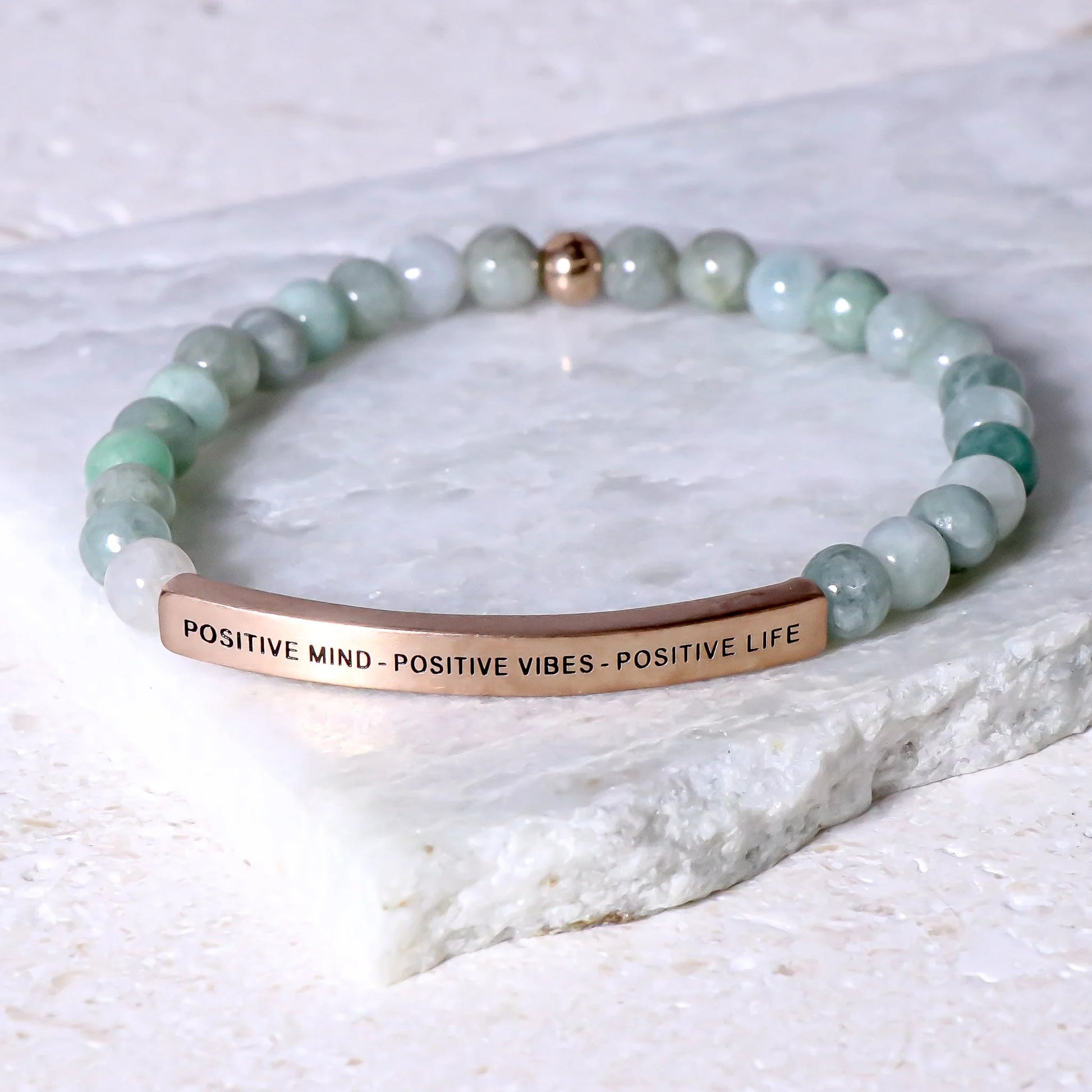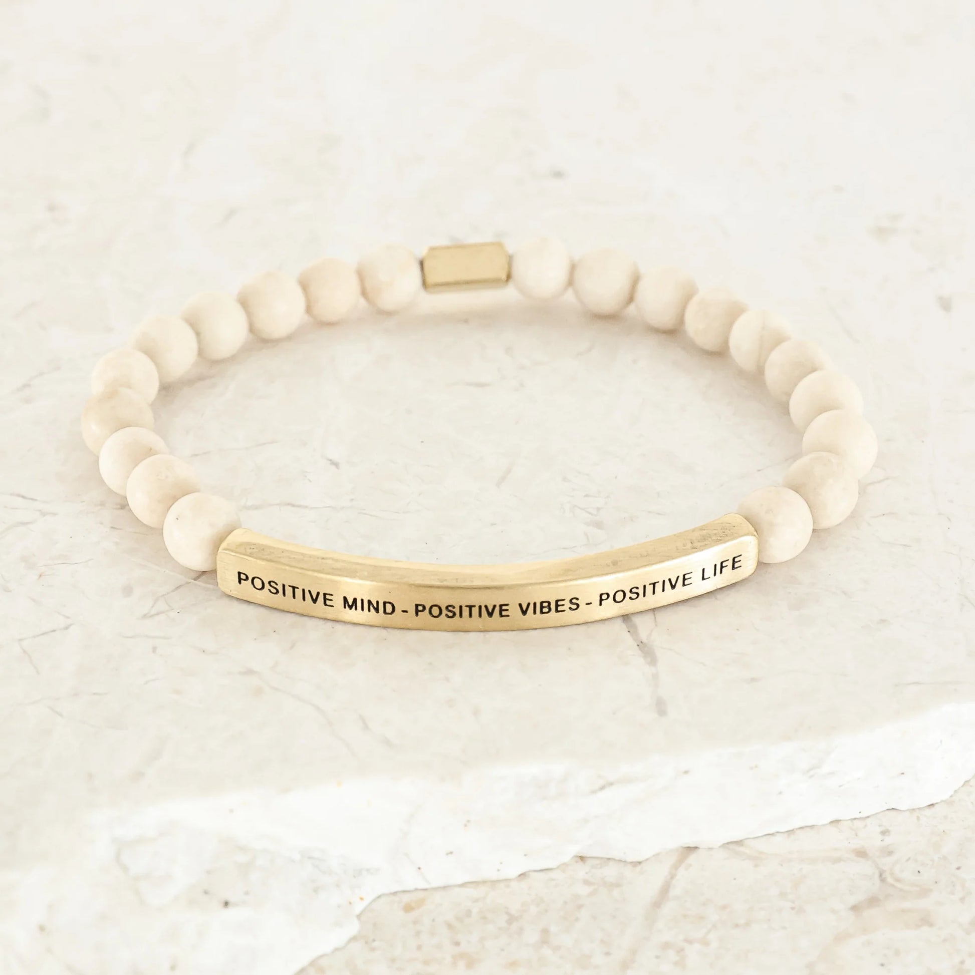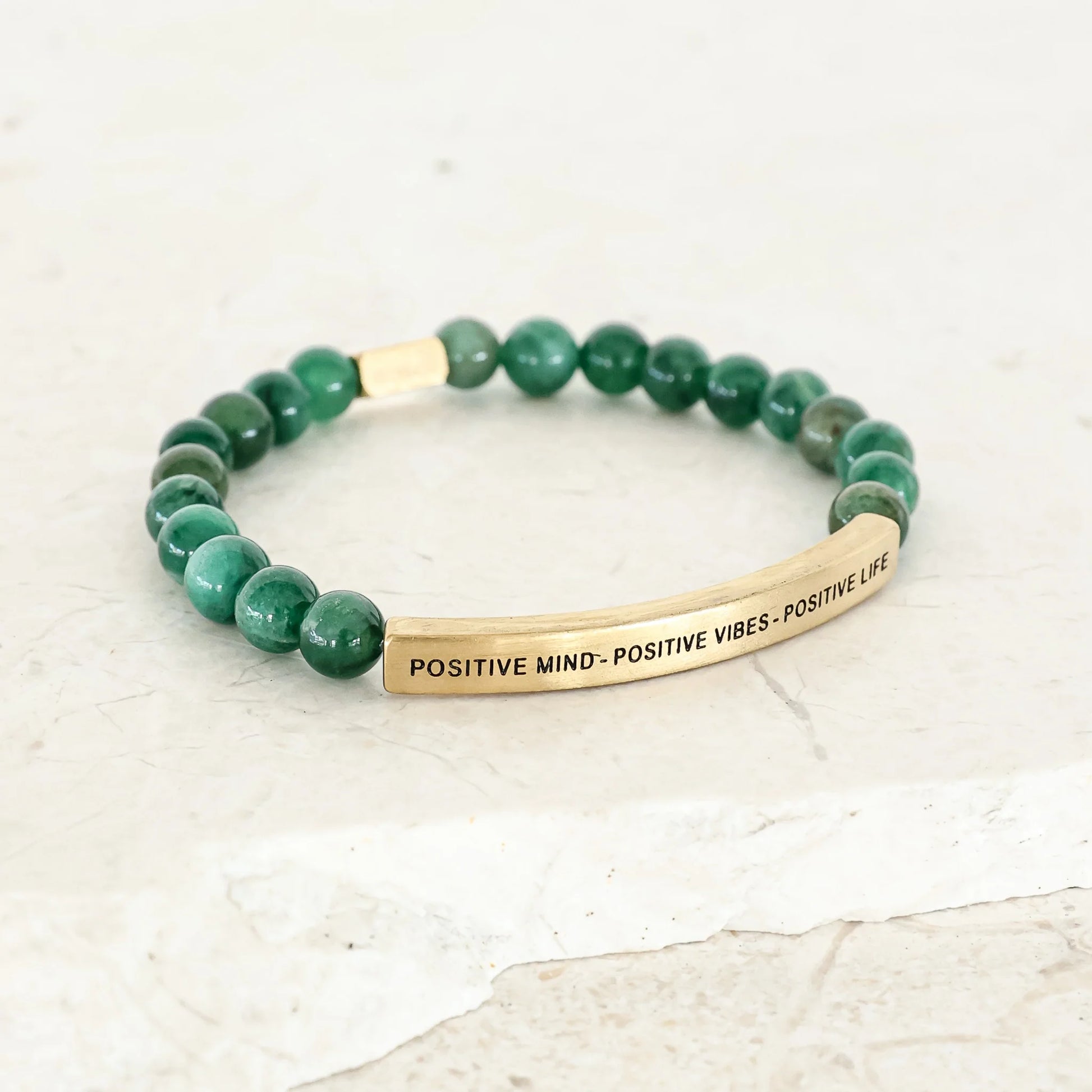 Our inspiration bracelets are beautiful reminders, crafted with 100% all-natural earth stone beads and an engraved stainless steel bar. Wear them throughout the day as a source of inspiration.